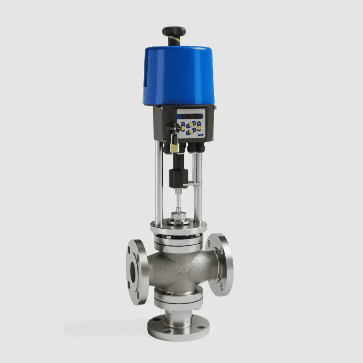 The electric actuator adjusts the position of the internal valve cores, precisely controlling the ratio of the two incoming flows. This ensures stable output conditions even when inlet temperatures or pressures fluctuate.